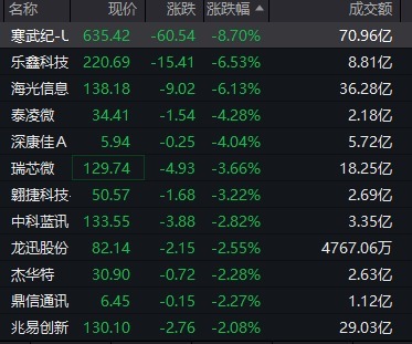 金融界1月16日消息,芯片股重挫,寒武纪扩大跌幅扩大,盘中一度跌超16%,截至发稿跌8.7%,成交超70亿元,海光信息、乐鑫科技跌超6%。